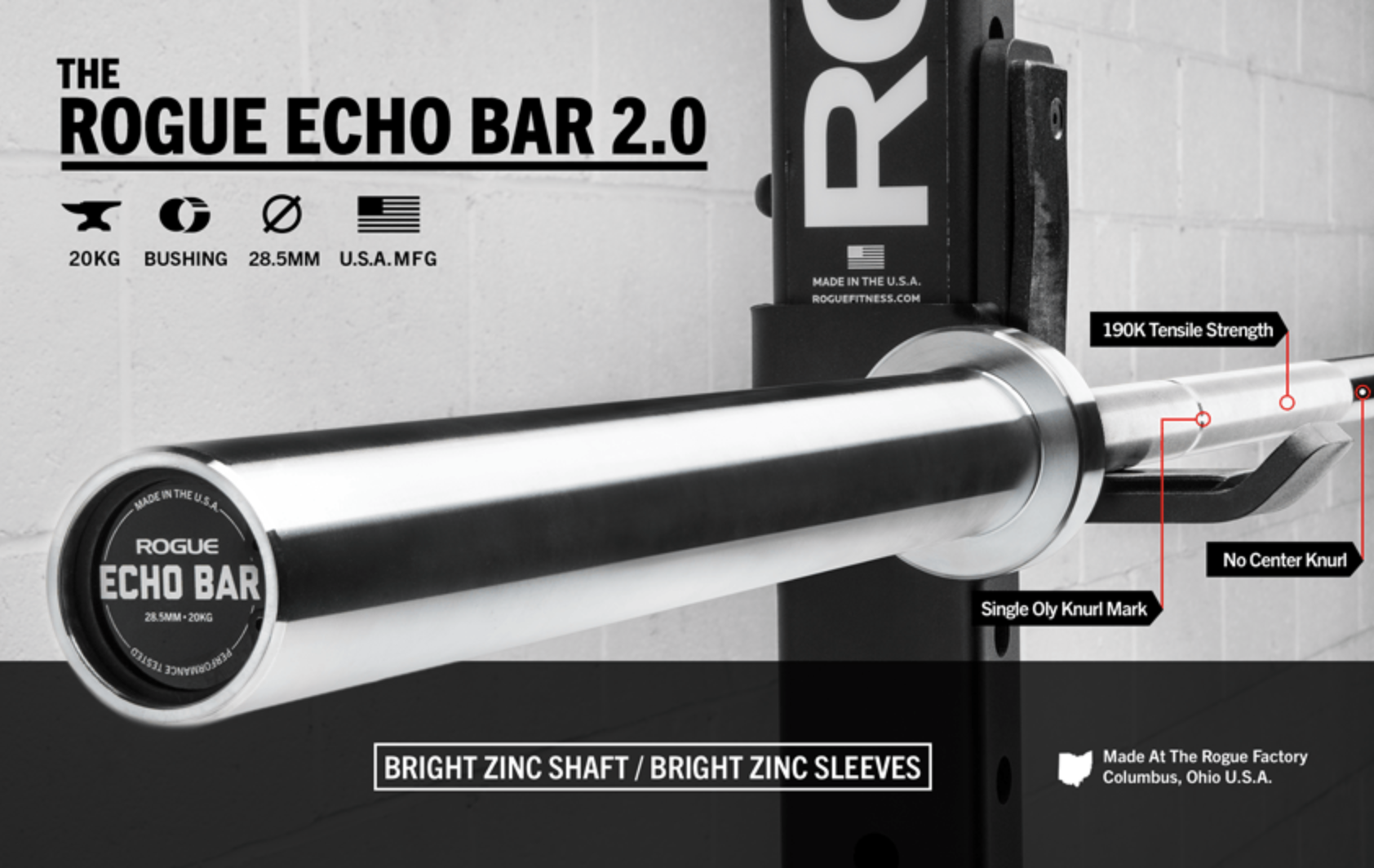 Winner - 1 Rogue Echo Bar 2.0: 190,000 PSI tensile strength steel shaft, bright zinc finish, upgraded snap ring sleeve construction, exclusive Echo branded endcaps, single IWF standard Olympic knurl marks (no center knurl or powerlifting marks) and 16.40" of loadable sleeve length.